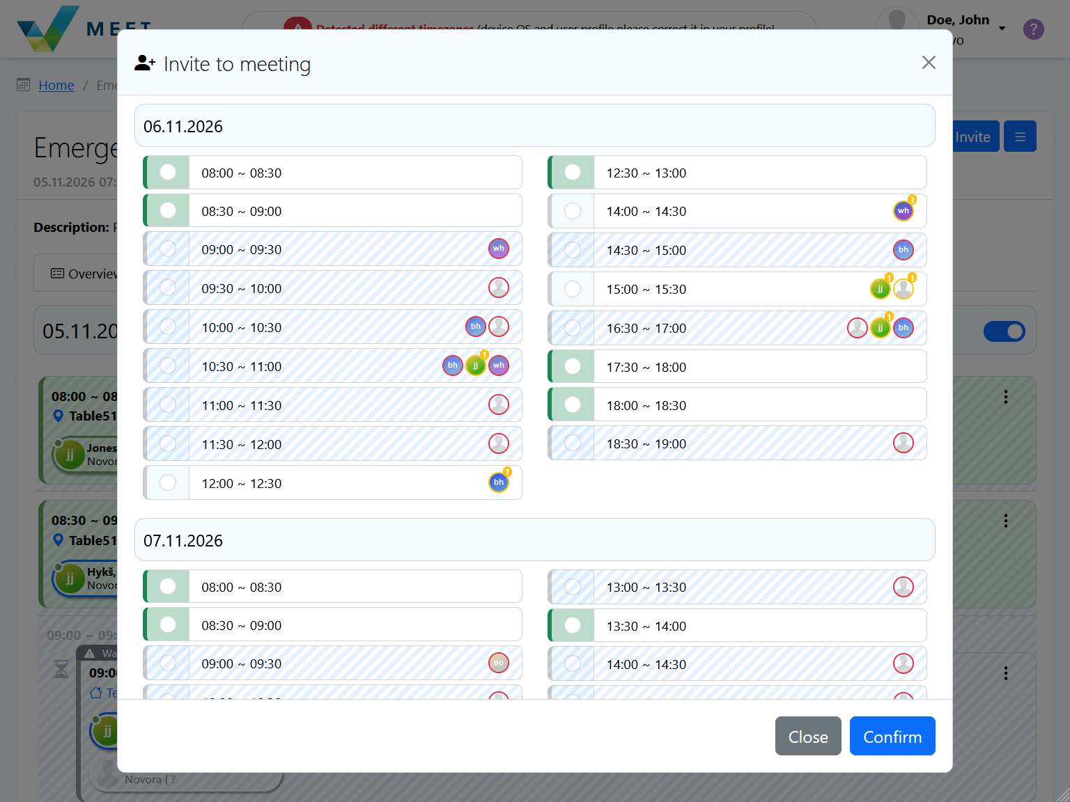 - Automatic detection of free slots of invited participants and table assignment.