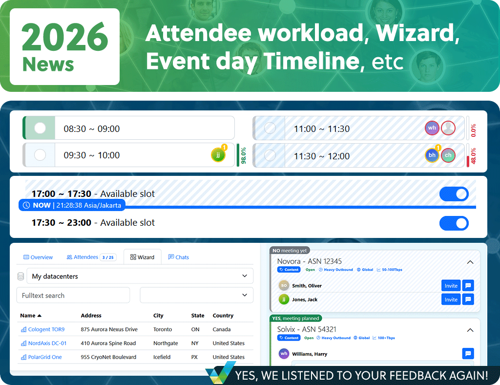 - Nově Wizard - propojuje kontakty z PeeringDB s registracemi uživatelů. Přehled o firmách a jejich zástupcích, se kterými se plánujete během eventu setkat.